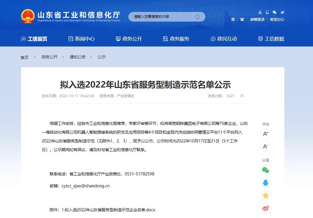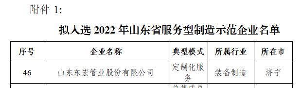2022年10月17日,山東省工業和信息化廳發布了《擬入選2022年山東省服務型制造示范名單公示》,公司成功入選2022年山東省服務型制造示范企業。