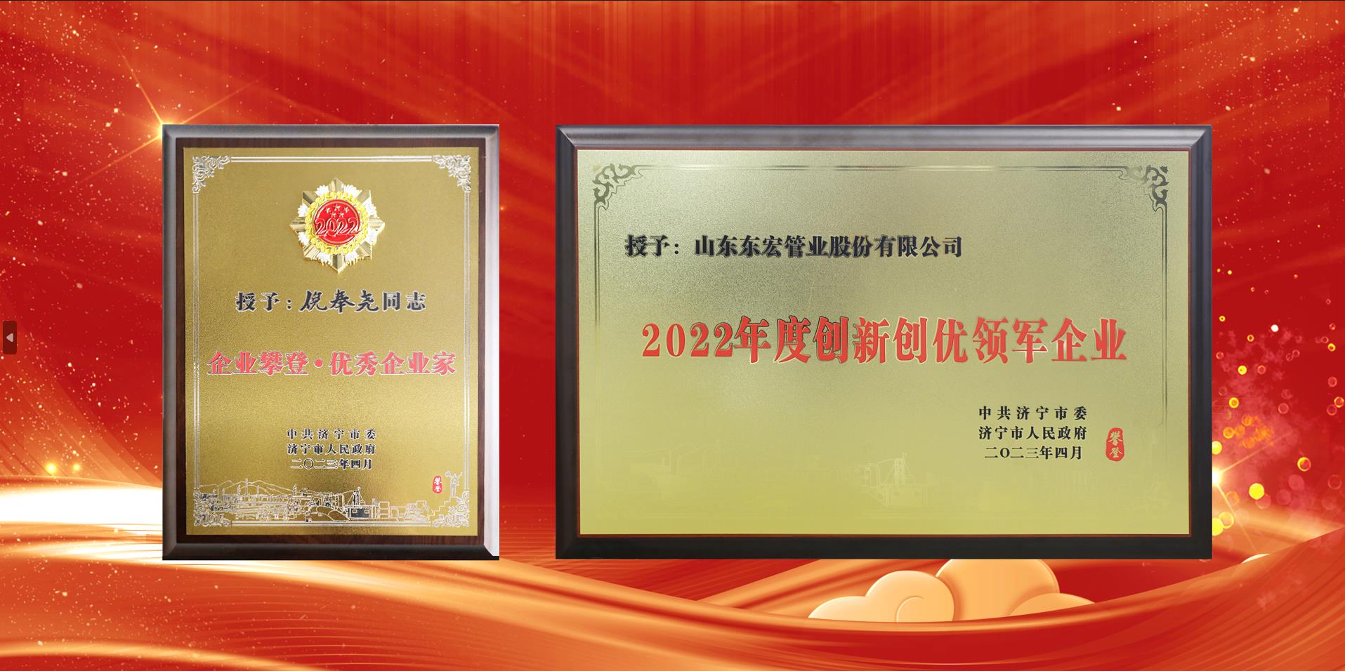 東宏集團黨委書記,東宏股份副董事長、總裁倪奉堯被授予濟寧市“企業(yè)攀登·優(yōu)秀企業(yè)家”稱號;山東東宏管業(yè)股份有限公司榮獲濟寧市“2022年度創(chuàng)新創(chuàng)優(yōu)領軍企業(yè)”稱號。