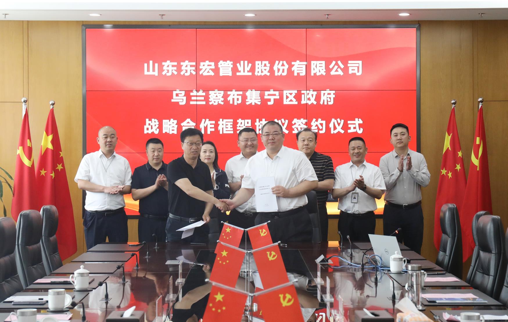 5月19日,公司與烏蘭察布市集寧區人民政府戰略合作協議簽約儀式在研發中心會議室隆重舉行。烏蘭察布市集寧區區委常委、常務副區長么海明,內蒙古(烏蘭察布)山東商會常務副會長孫風星、集寧區商務局局長傅麗萍、區投資促進中心主任李旭飛;集團黨委書記、東宏股份副董事長、總裁倪奉堯,董事會秘書尋金龍、蒙西市場總經理陳志剛、經理孔凡華等相關領導出席儀式。