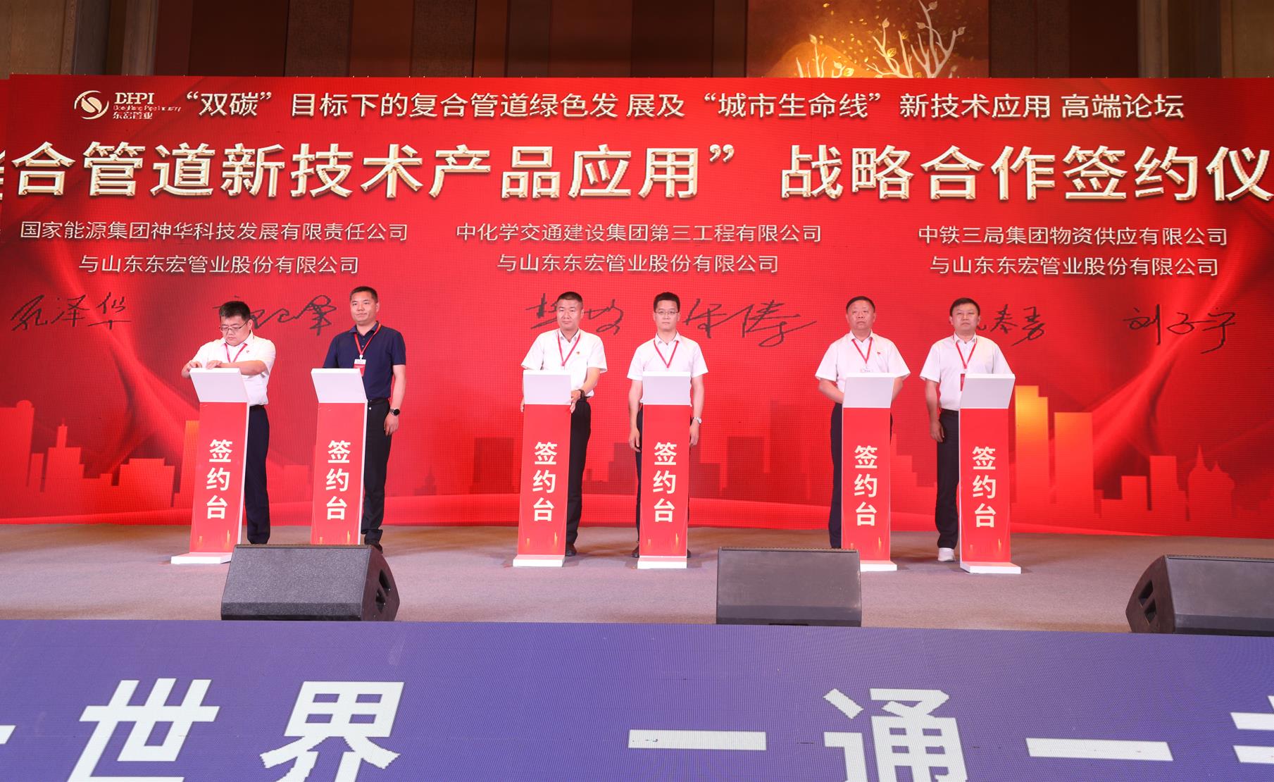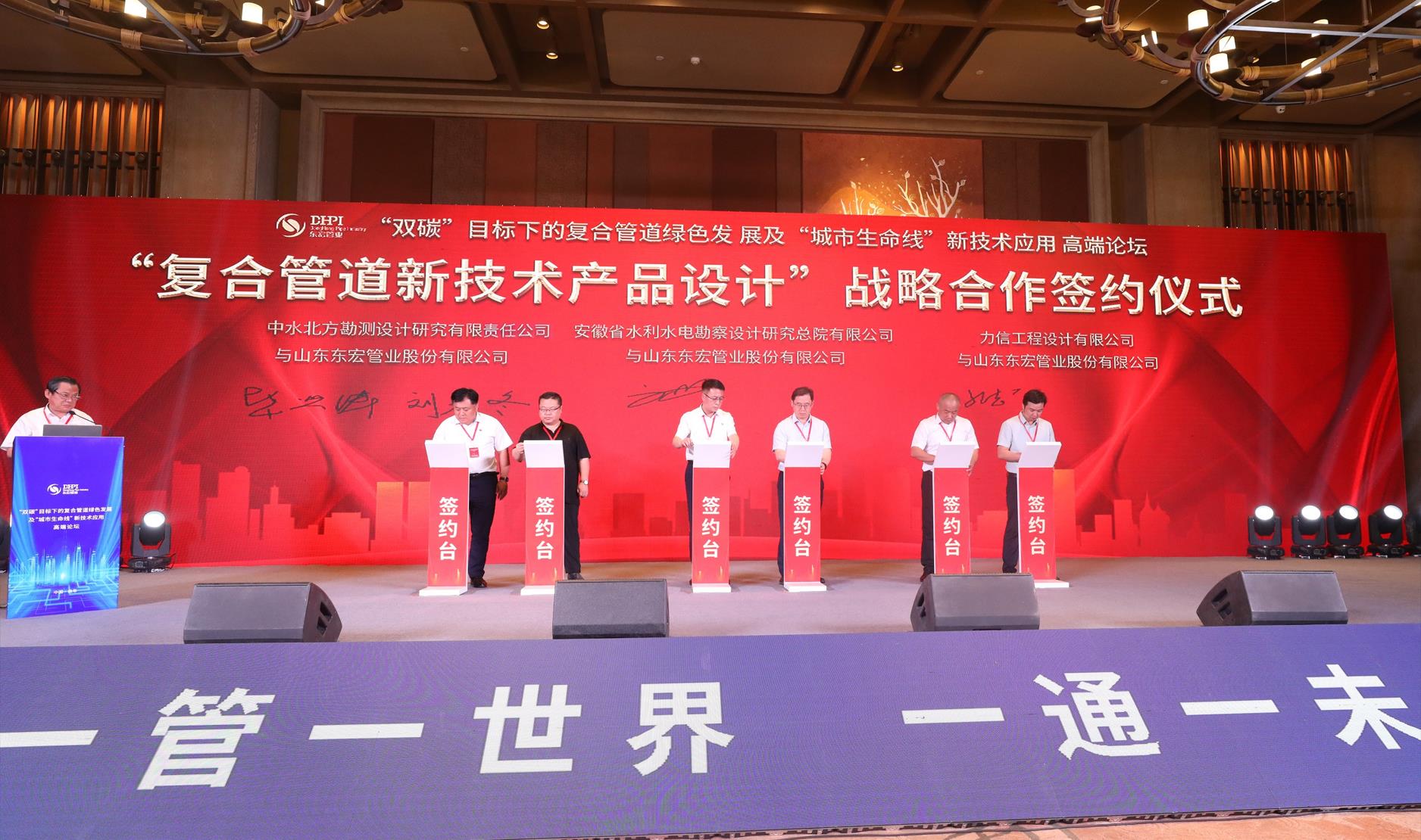 在8位業內領軍專家的精彩分享之后,本次論壇進入成果轉化環節,多家領域內代表性設計院和頭部企業與東宏股份進行了“復合管道新技術產品設計”戰略合作簽約儀式和“復合管道新技術產品應用”戰略合作簽約儀式。