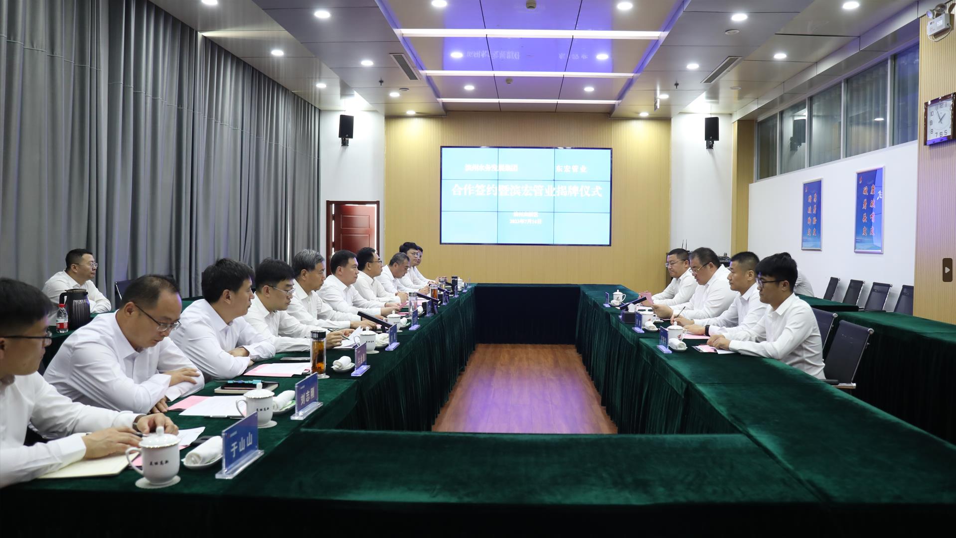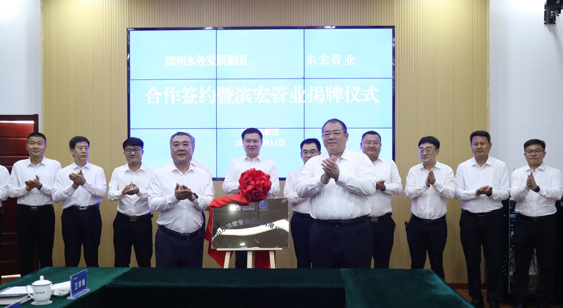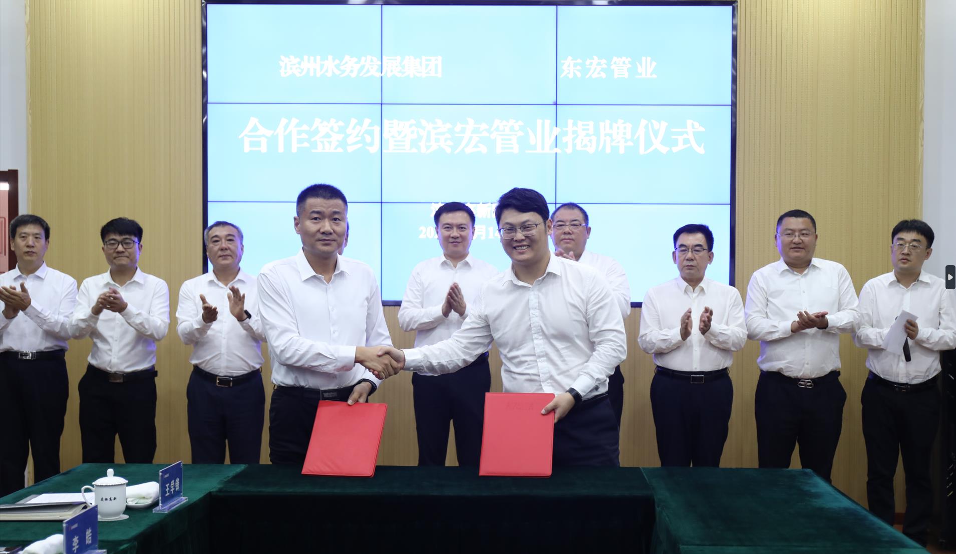 7月14日,濱州水務發展集團有限公司與山東東宏管業股份有限公司合作協議簽約暨山東濱宏管業科技有限公司揭牌儀式隆重召開。濱州市委常委、副市長,濱州高新區黨工委書記屈躍寬,濱州高新區黨工委副書記、管委會主任劉衛忠,濱州水務發展集團黨委副書記、副董事長、總經理董建忠,濱州高新區黨工委委員、副主任劉毅,濱州水務發展集團黨委委員、副總經理李皓;東宏集團黨委書記,公司副董事長、總裁倪奉堯,東宏集團黨委副書記,公司副總裁樊鵬,董事會秘書尋金龍,財務部部長李康華參加活動?;顒佑蓜⒁阒鞒?。