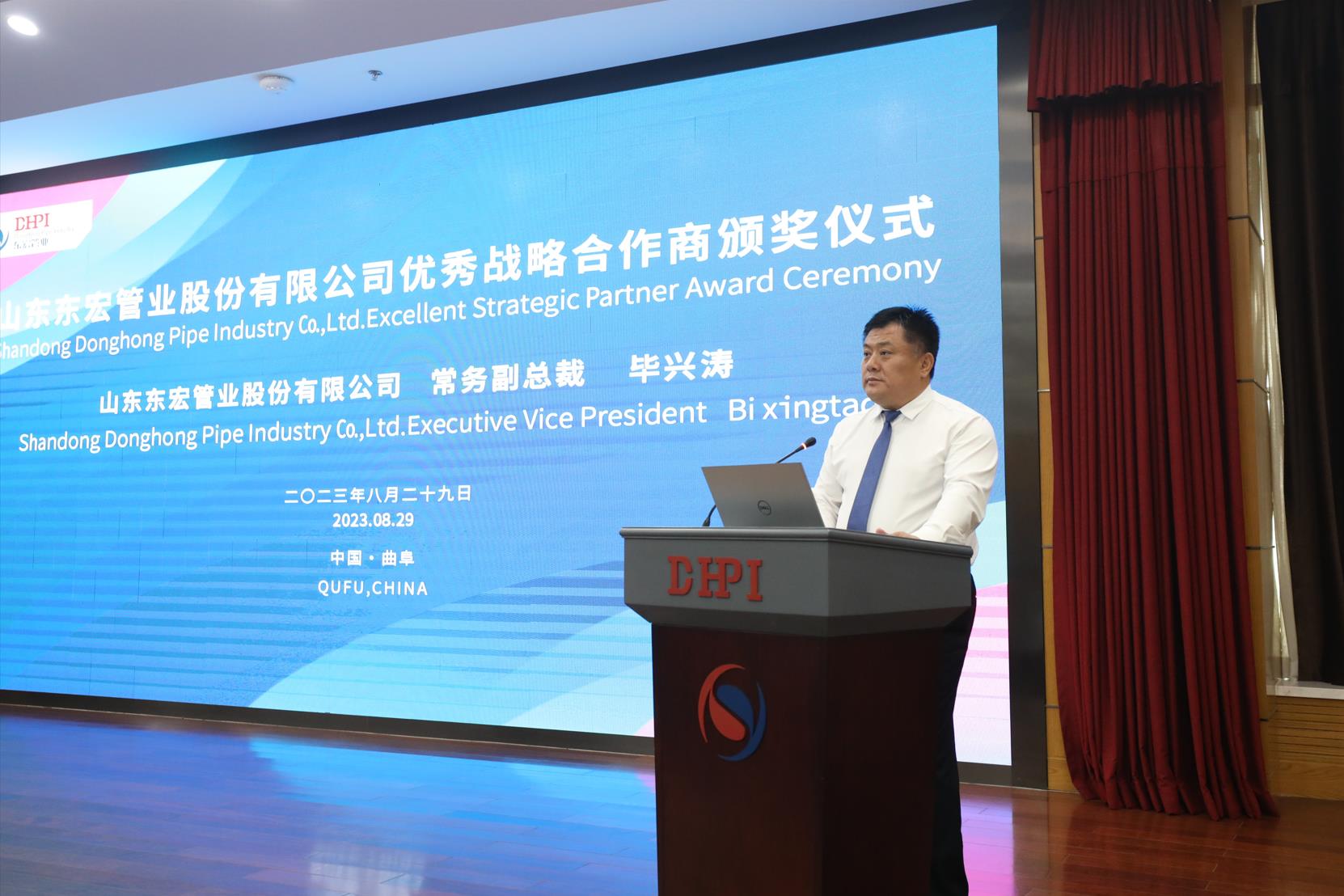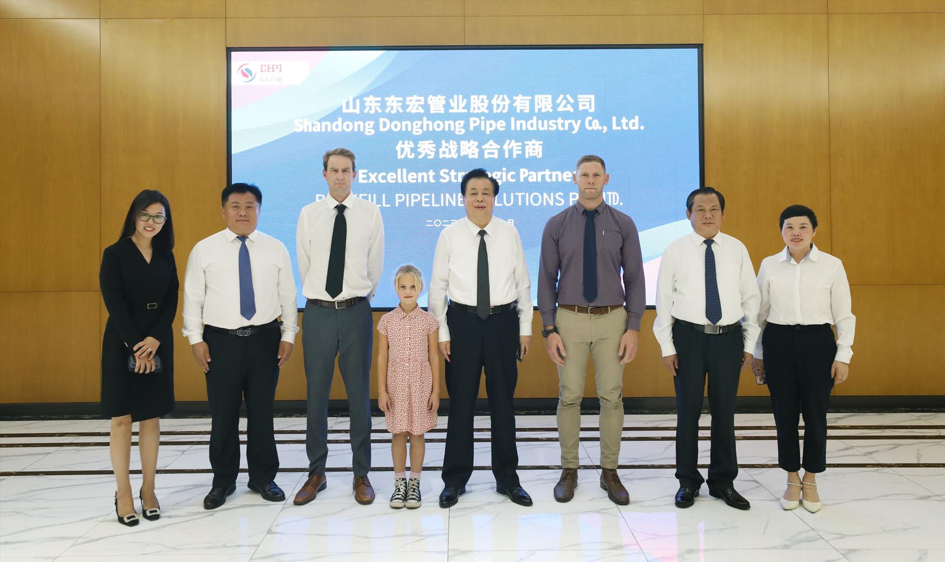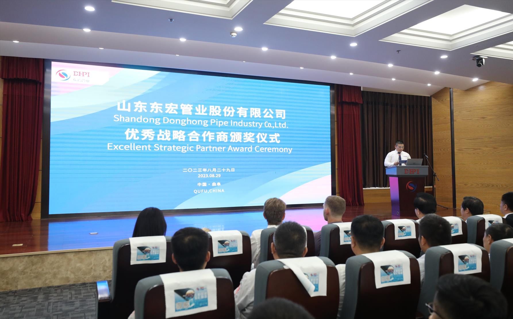 2023年8月29日,東宏股份優(yōu)秀戰(zhàn)略合作商頒獎儀式在研發(fā)中心多功能會議廳隆重舉行。澳大利亞BACKFILL PIPELINE SOLUTIONS PTY CO.,LTD. 總經(jīng)理Richard,合伙人Mat Revell、營銷總經(jīng)理賈秋利;公司董事長倪立營、經(jīng)營管理層以及營銷、職能部門人員參加儀式,監(jiān)事會主席、辦公室主任馬伯群主持儀式。