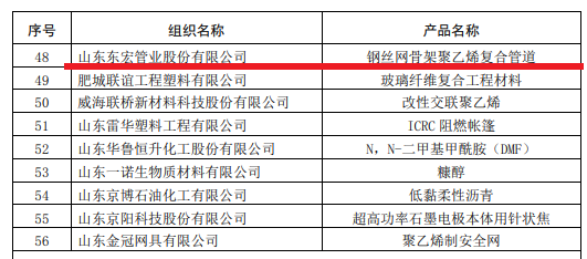 2023年9月12日,由山東省市場監管局會同省委宣傳部、省發展改革委、淄博市政府共同主辦的山東省2023年“質量月”啟動儀式在淄博舉行。活動緊扣“共建質量新格局,共享發展新成果”主題,公布第二批“好品山東”品牌名單,其中制造業企業(產品)品牌84個,東宏管業申報的“鋼絲網骨架聚乙烯復合管道”入選制造業企業(產品)品牌。